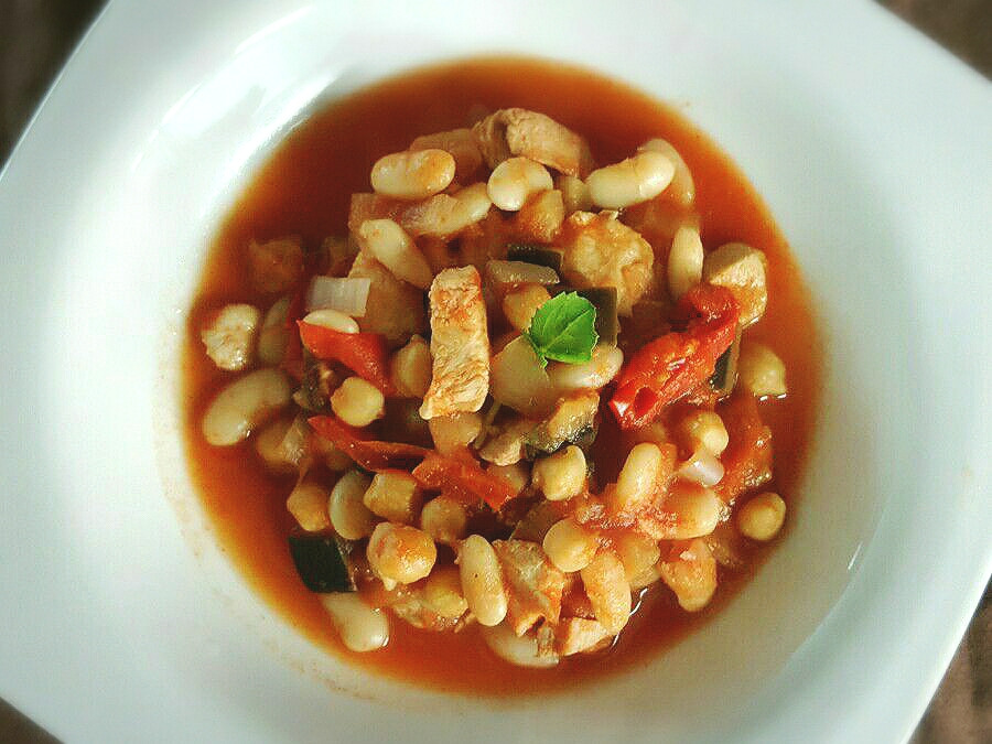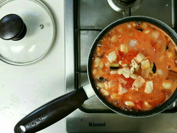 흰강낭콩, 병아리콩, 토마토, 가지, 닭가슴살, 시금치, 토마토퓨레