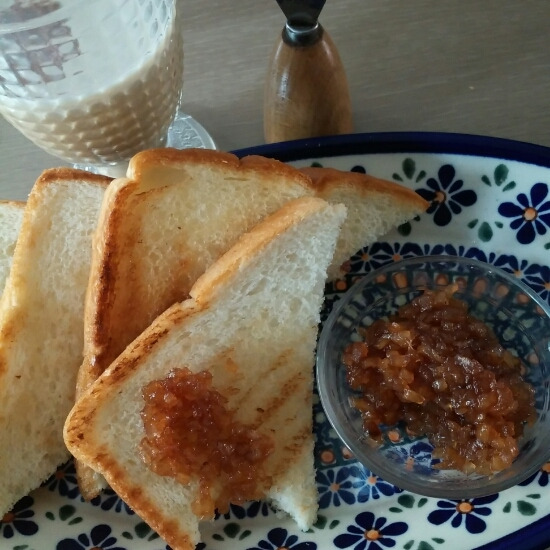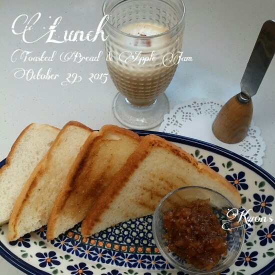 버터를 두른 그릴팬에 빵을 구워 사과잼 올려먹으니